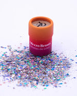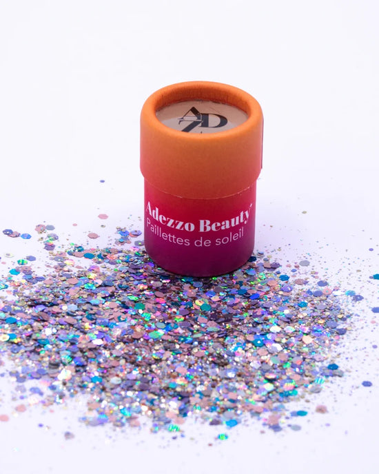Paillettes biodégradables, 100% sans plastique. Designées en Provence. Pour un maquillage festif : visage, cheveux, corps.